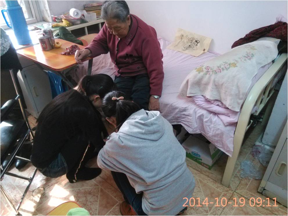 12本党支部19名党员作为本次服务的志愿者参加了活动。临近九点,志愿者们抵达哈尔滨德福助老家庭。工作人员强调注意事项后,志愿者们在公寓阿姨的安排下开始志愿服务。首先,志愿者们进入各房间和老人们结对并认真地为他们洗脚;而后,志愿者们开始和老人进行亲切的交流,或陪他们聊天解闷,或聆听他们讲故事。有同学为老人带了些水果,有同学则将自己的书法作品敬上留作纪念。最后,志愿者们与老人道别并与部分老人进行了合影。