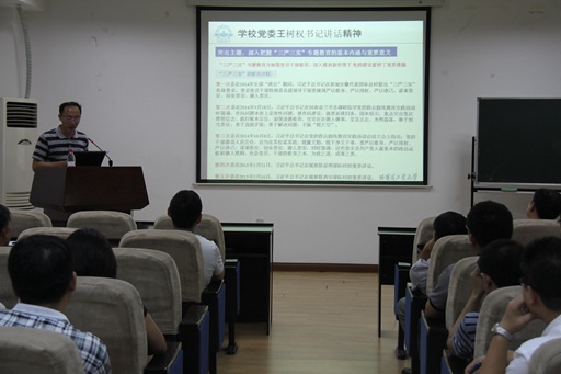 领导班子成员、各系、中心主任、副主任,党支部书记及教师、学生党员代表等参加了本次党课学习。耿书记的报告分为:王树权书记“三严三实”报告精神传达和“三严三实”问题摆查及整改意见两个部分。