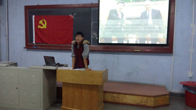接下来进行自由讨论环节,大家各抒己见,对相关问题进行了积极交流讨论。有同学表示,习近平总书记的两次访问都受到了很高规格的接待,进行了很多实质性的合作和并在国际上形成良好影响,我们深深地为党和国家感到自豪;有同学则提出,合作和发展同在,机遇与挑战并存,无论是发展网络科技等重点合作,还是建设“一带一路”的战略构想,都需要我们以更加积极的姿态应对;也不乏同学对习近平总书记在外交上展现的风采表示赞赏和敬仰。同时,也有同学提醒大家,党的十八届五中全会已经召开,大家也要积极关注,认真学习。