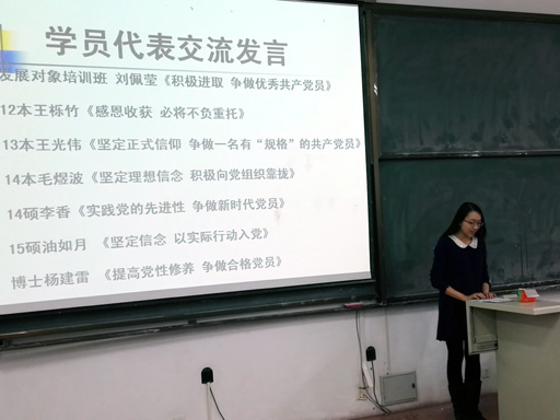 分党校汇报两个培训班管委会的工作情况,并与大家分享了近一个多月学习及工作等方面的心得体会。各年级学员代表也在会上交流了学习感言。发展对象培训班14本刘佩莹《积极进取争做优秀共产党员》;入党积极分子培训班12本王栎竹《感恩收获必将不负重托》、13本王光伟《坚定政治信仰争做一名有“规格”的共产党员》、14本毛煜波《坚定理想信念积极向党组织靠拢》、14硕李香《实践党的先进性争做新时代党员》、15硕油如月《坚定信念以实际行动入党》以及博士生杨建雷《提高党性修养争做合格党员》都真实地表达了他们在此次培训班学习的深切感受。学员们纷纷表示,短期的培训学习虽然结束了,但是他们在今后的学习、生活、工作中,将始终坚持以党员的标准要求自己,努力提高自身的思想政治素养和党性修养,以实际行动争取早日加入党组织!