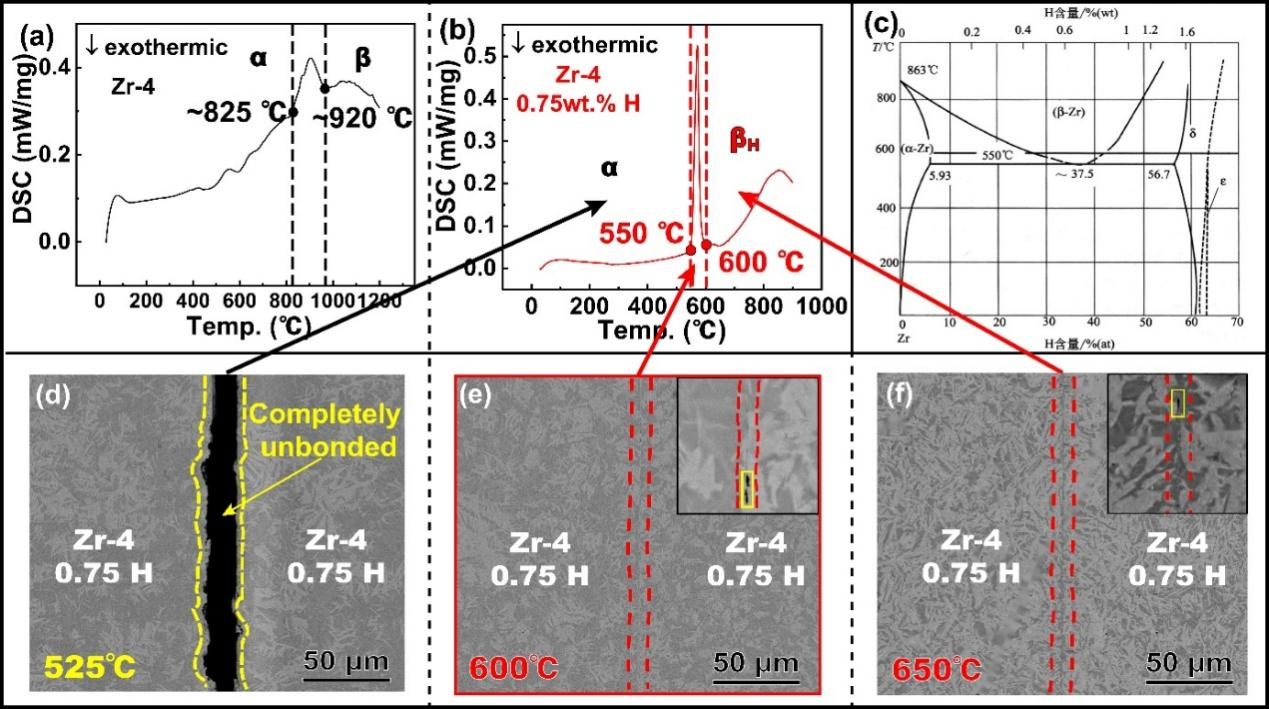 图1 氢化Zr-4 合金相变及扩散连接接头组织:(a) Zr-4 合金DSC曲线;(b) 氢化Zr-4合金DSC曲线;(c) Zr-H二元相图;(d)相变前氢化Zr-4接头界面SEM图像;(e) 相变中氢化Zr-4接头界面SEM 图像;(f) 完全相变后氢化Zr-4接头界面SEM图像。